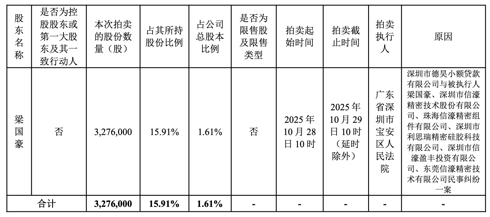 信濠光电9月29日再次公告,梁国豪握有的327.6万股公司股份将被端正拍卖,拍卖日历为2025年10月28日10时至2025年10月29日10时止(延时之外)。